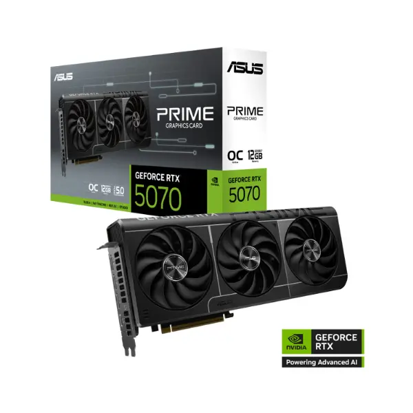 أطلق العنان لأداء استثنائي مع بطاقة برايم جي فورس ار تي اكس 5070، وهي بطاقة GeForce مصممة لهواة SFF، بتصميم بفتحتين ونصف لتوافق واسع. تتميز بنظام تبريد ثلاثي المراوح مصمم لتدفق هواء ممتاز وإدارة حرارة فائقة.