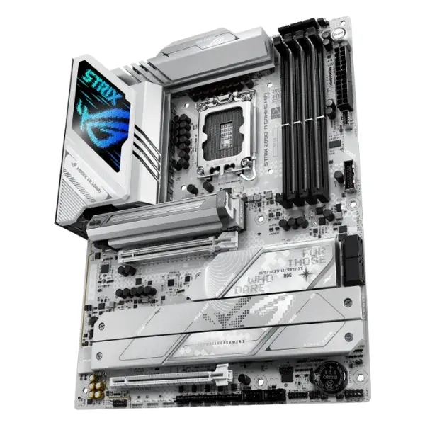 تتميز المازر بورد روج ستريكس Z890-A بلمسة نهائية بيضاء أنيقة تُضفي لمسة جمالية عصرية وأنيقة، وتتناغم بسلاسة مع مجموعة واسعة من أجهزة الكمبيوتر. يُعزز مشتتات الحرارة المعدنية هذا المظهر الأنيق، بينما تتيح لك إضاءة Polymo القابلة للتخصيص على غطاء منافذ الإدخال/الإخراج التبديل بين إضاءة أنيقة وبسيطة أو شاشة جريئة وملونة.