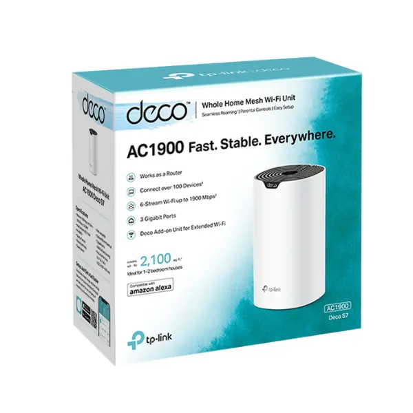 يدعم نظام تي بي لينك ديكو S7 واي فاي 5 (AC1900) معياري IEEE 802.11ac/n/a على تردد 5 جيجاهرتز و802.11n/b/g على تردد 2.4 جيجاهرتز، مما يوفر سرعات تصل إلى 1300 ميجابت في الثانية على تردد 5 جيجاهرتز و600 ميجابت في الثانية على تردد 2.4 جيجاهرتز. وهو مثالي للمنازل المكونة من غرفة نوم واحدة إلى غرفتي نوم (مجموعة واحدة)، ويستخدم تقنية TP-Link Mesh مع وصلة إيثرنت اختيارية لتغطية سلسة. مزود بثلاثة هوائيات داخلية، وتقنية تشكيل الشعاع، وأبعاد صغيرة تبلغ 162.3 × 90.7 × 90.7 مم، مما يضمن تغطية إشارة أقوى وأوسع.