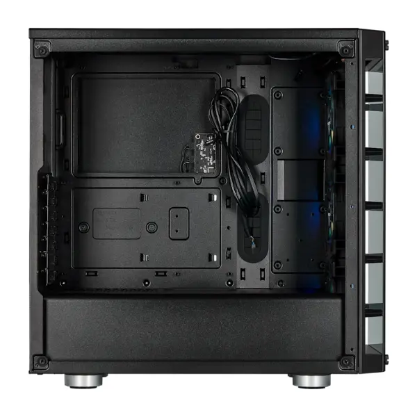 Inside, the Corsair 465X RGB offers ample room for powerful hardware. It supports Mini-ITX, Micro-ATX, and ATX motherboards, with space for GPUs up to 300mm, CPU coolers up to 160mm, and power supplies up to 180mm. Storage flexibility is impressive, allowing installation of two 3.5-inch HDDs and four 2.5-inch SSDs, making it ideal for gamers and content creators alike. The RapidRoute cable management system and dedicated tie-downs simplify cabling, ensuring a clean and professional-looking build that maximizes airflow efficiency.