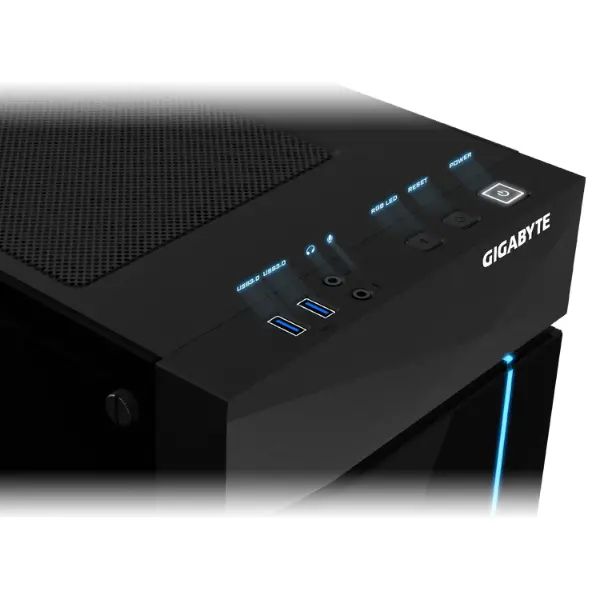The top I/O panel of the Gigabyte C200 Glass provides all the essential ports within easy reach, including two USB 3.0 ports, audio jacks, and dedicated buttons for power, reset, and RGB control. The thoughtful layout ensures convenience during daily use, allowing users to connect peripherals, headsets, and external drives quickly. This intelligent design emphasizes accessibility and smooth user experience, enhancing both style and practicality.