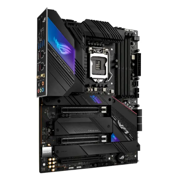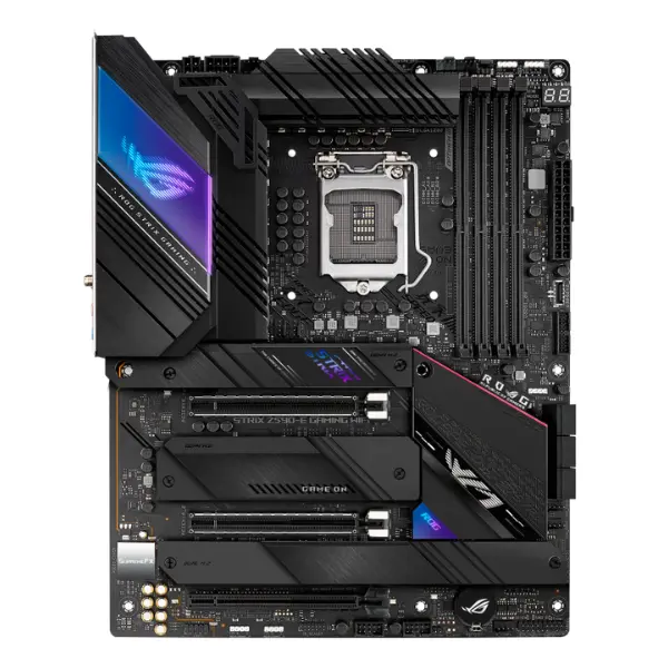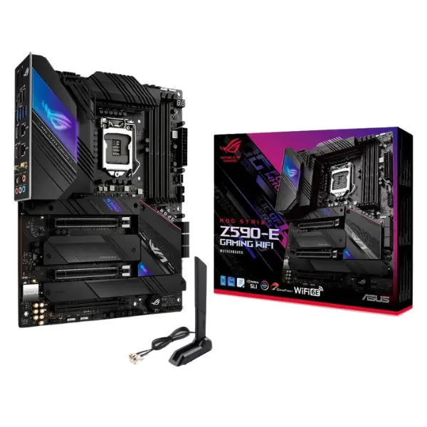 The ASUS ROG Strix Z590-E Gaming WiFi is a premium ATX motherboard built for high-end gaming and productivity, designed to support Intel LGA1200 10th and 11th Gen Core, Pentium Gold, and Celeron processors. Featuring the Intel Z590 chipset, it delivers PCIe 4.0 support for ultra-fast data transfer across multiple high-speed interfaces. The board is equipped with a robust 14+2 power stage VRM design, ProCool II power connector, premium alloy chokes, and durable capacitors, ensuring stable power delivery for demanding multi-core CPUs.