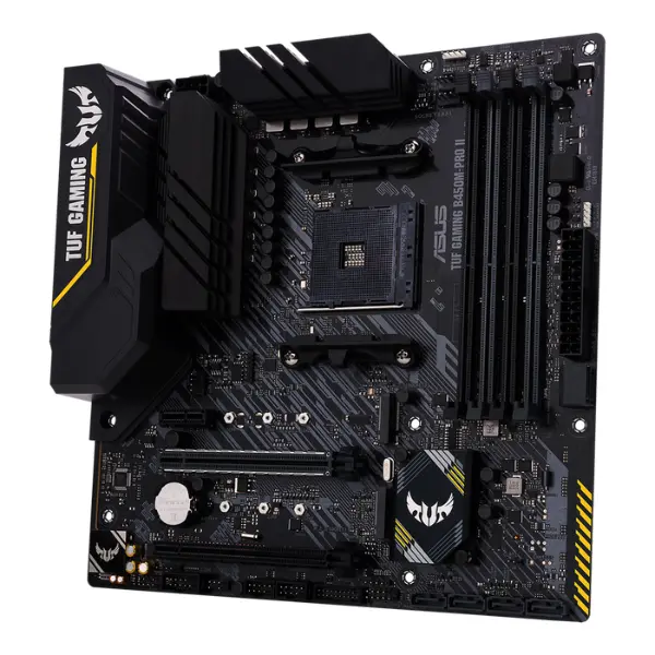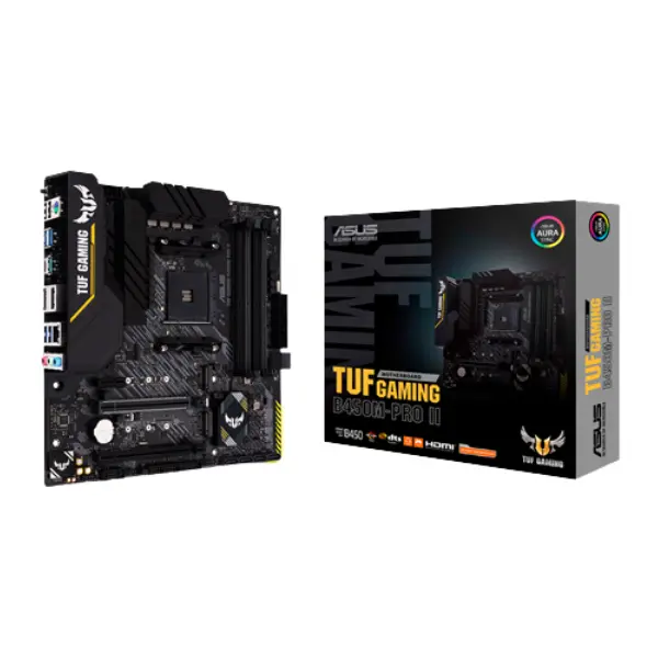 Asus TUF Gaming B450M-PRO II is a feature-packed micro ATX motherboard built on the reliable AMD B450 chipset, designed to deliver durability, stability, and performance for gamers. With support for AMD AM4 Ryzen processors, dual M.2 slots, PCIe 3.0, and next-generation USB 3.2 Gen 2 Type-A and Type-C, it provides the foundation for a powerful and future-ready gaming PC. Engineered with military-grade components and robust cooling, this board ensures long-lasting performance even under heavy loads.