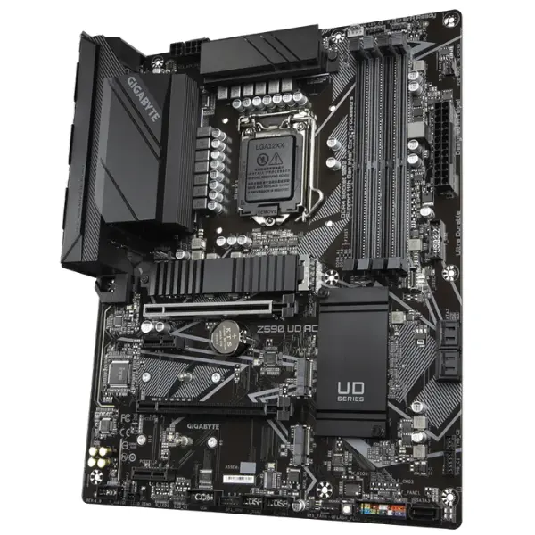 The Gigabyte Z590 UD AC is an Intel® Z590 Ultra Durable ATX motherboard designed for reliability, performance, and modern connectivity. It supports 11th and 10th Gen Intel® Core™ processors with dual-channel DDR4 across four DIMM slots. Built with stability in mind, it uses a direct 12+1 phases digital VRM with 50A DrMOS and an enlarged heatsink design for efficient cooling.