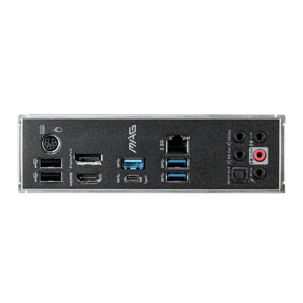 Measuring 24.3 cm x 24.3 cm, this micro-ATX motherboard fits easily into smaller cases while still offering powerful features. Back panel connectivity includes USB 3.2 Gen 1 Type-A and Type-C ports, HDMI, DisplayPort, 2.5G LAN, optical S/PDIF, and HD audio connectors, making it versatile for gaming or workstation builds.