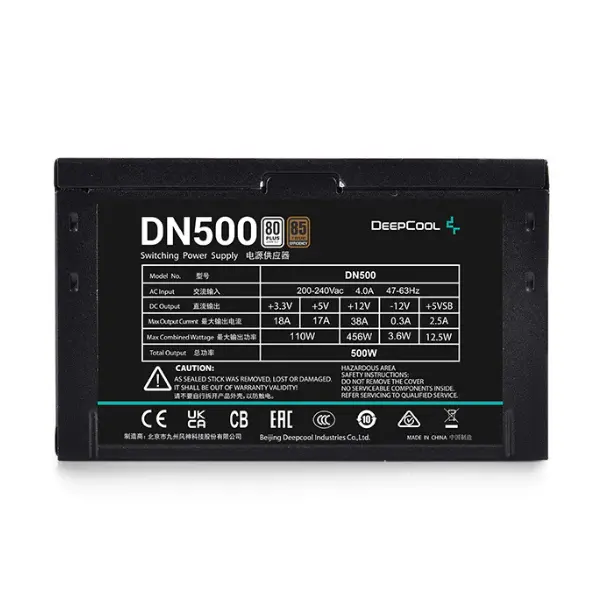 Measuring 150 x 140 x 86 mm, the DN500 follows the ATX 12V v2.4 standard, ensuring broad compatibility with most modern PC cases and motherboards. Its compact form factor makes it suitable for various configurations, from standard office PCs to gaming rigs. The clean, minimalistic exterior fits seamlessly into any build aesthetic, while the interior layout is optimized for efficient heat dissipation and airflow.