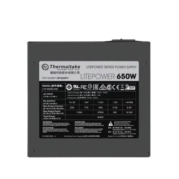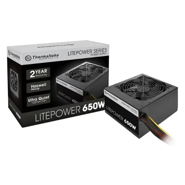 The Thermaltake LT-650P Litepower 650W power supply is designed for desktop users who need efficiency, stability, and reliability at an affordable price point. Built under the ATX 12V v2.3 standard, this PSU supports modern Intel and AMD processors, as well as mainstream graphics cards, making it a solid choice for home, office, and entertainment systems. With active PFC, strong voltage regulation, and a dedicated +12V rail, the LT-650P ensures consistent performance even under heavy workloads.