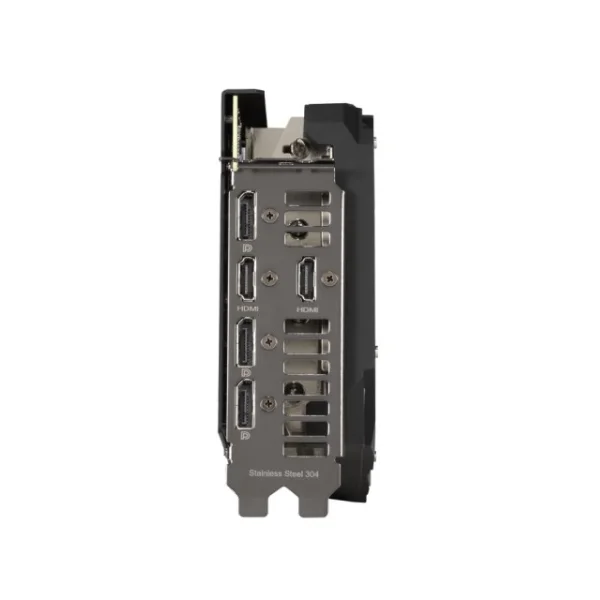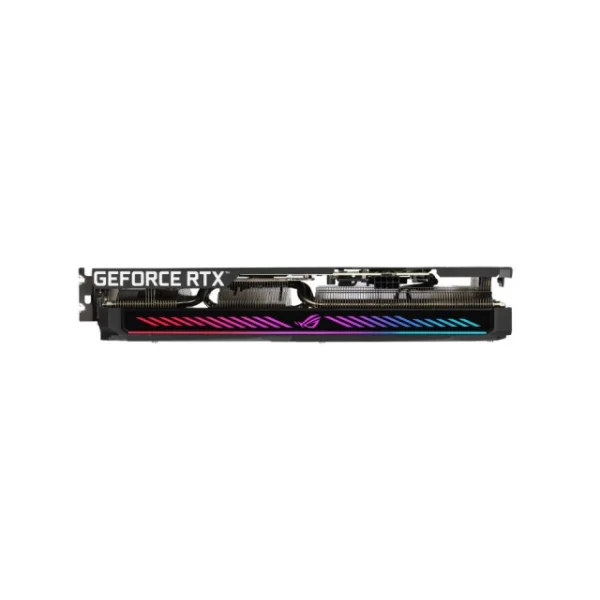 The front edge of the card features customizable RGB lighting compatible with Armoury Crate software for syncing effects across other ROG components. Powering the GPU is an 8-pin connector with a built-in voltage monitoring circuit that signals PSU instability through a red LED alert, ensuring safe and consistent power delivery during heavy gaming.