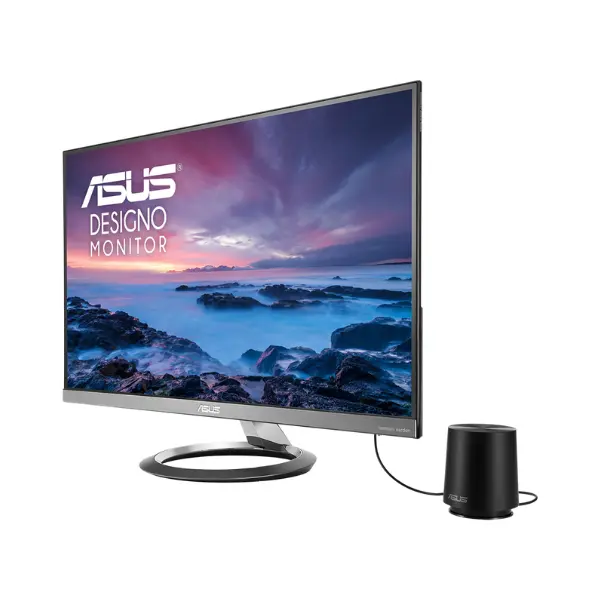 The ASUS Designo MZ27AQ Ultraslim Monitor is a 27-inch display with a WQHD resolution, offering 100% sRGB color coverage and broad viewing angles thanks to its IPS panel. It boasts a frameless design with an incredibly slim 7mm chassis. The monitor comes equipped with a robust 2.1-channel audio system, featuring two 6W stereo speakers and an external 5W subwoofer developed in collaboration with Harman Kardon. Additionally, ASUS Eye Care technology, certified by TÜV Rheinland, ensures a comfortable viewing experience by eliminating flicker and reducing blue light emissions.