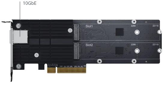 The Synology E10M20-T1 is more than just a 10GbE adapter card; it's a performance accelerator. This card is NVMe-enabled, boasting dual M.2 2280/22110 NVMe SSD slots that can significantly enhance your random I/O performance. Whether you're using it for cache acceleration or data storage, the blazing speed of NVMe SSDs ensures that your Synology NAS operates at its peak efficiency. Say hello to reduced latency, quicker access times, and an overall snappier user experience.